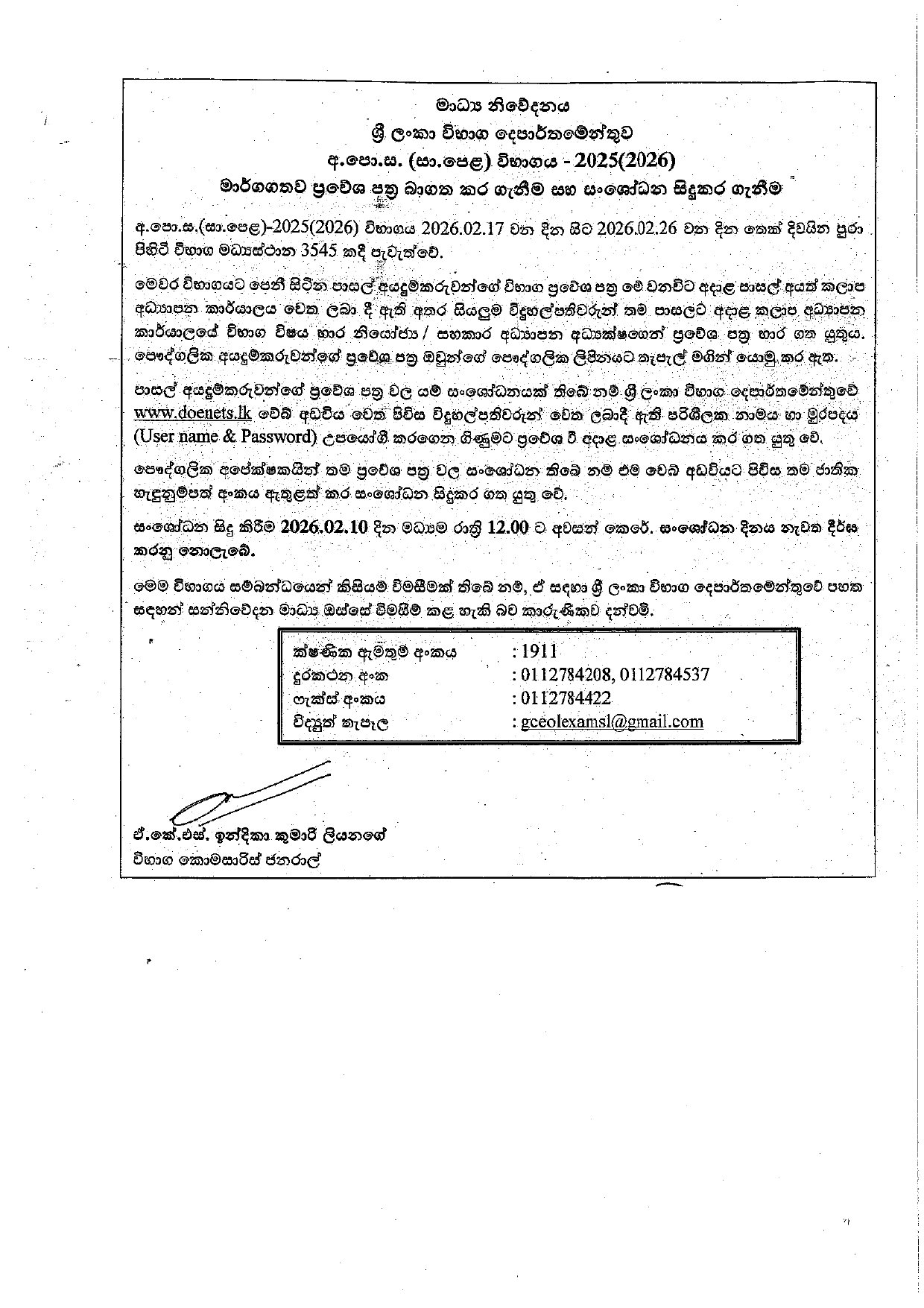 News අ.පො.ස. සා. පෙළ විභාගයේ online ප්රවේශ පත්ර ලබාගැනිම සහ සංශෝධන By Kumari February 3, 2026 0 115 Share FacebookTwitterWhatsApp Must read වෙරළ ආරක්ෂක නිලධාරීන්ට තර්ජනය කළ වෙල්ලමංකරයේ ජාවාරම්කරුවෙකු අත්අඩංගුවට March 6, 2026 ක්ෂුද්ර මූල්ය ක්ෂේත්රය, නියාමනයට රජයේ අවධානය March 6, 2026 ජාත්යන්තර මුහුදට යන අපේ බහුදින ධීවර යාත්රාවල ආරක්ෂාවට ගැටලුවක් නැහැ March 6, 2026 ගල් අඟුරු වාර්තාව : කෝටි 848ක පාඩුවක් ! – වහා දඩ අය කරන්නැයි කමිටුවෙන් නියෝග March 5, 2026 Kumari 2025 (2026) අ.පො.ස. සාමාන්ය පෙළ විභාගයේ මාර්ගගතව ප්රවේශ පත්ර බාගත කිරීම සහ සංශෝධනය සිදුකර ගැනීම සම්බන්ධව ශ්රී ලංකා විභාග දෙපාර්තමේන්තුවෙන් නිවේදනයක් නිකුත් කර ඇත. එම නිවේදනය පහත දැක්වේ. Share FacebookTwitterWhatsApp Previous articleධීවරයින්ට පහරදිමට එරෙහිව බහුදින යාත්රාකරුවන්ගේ විරෝධයNext articleකුණාටුවට ගැලවුන, කරවල වාඩියේ වහලට තාම වන්දියක් ලැබුනේ නෑ - Advertisement - More articles වෙරළ ආරක්ෂක නිලධාරීන්ට තර්ජනය කළ වෙල්ලමංකරයේ ජාවාරම්කරුවෙකු අත්අඩංගුවට March 6, 2026 ජාත්යන්තර මුහුදට යන අපේ බහුදින ධීවර යාත්රාවල ආරක්ෂාවට ගැටලුවක් නැහැ March 6, 2026 මාරවිල නිවසක් කොල්ලකෑ සැකකරුවන් පසුපස පොලිස් විමර්ශන March 5, 2026 LEAVE A REPLY Cancel reply Comment: Please enter your comment! Name:* Please enter your name here Email:* You have entered an incorrect email address! Please enter your email address here Website: Save my name, email, and website in this browser for the next time I comment. Δ - Advertisement - Latest article වෙරළ ආරක්ෂක නිලධාරීන්ට තර්ජනය කළ වෙල්ලමංකරයේ ජාවාරම්කරුවෙකු අත්අඩංගුවට March 6, 2026 ක්ෂුද්ර මූල්ය ක්ෂේත්රය, නියාමනයට රජයේ අවධානය March 6, 2026 ජාත්යන්තර මුහුදට යන අපේ බහුදින ධීවර යාත්රාවල ආරක්ෂාවට ගැටලුවක් නැහැ March 6, 2026 ගල් අඟුරු වාර්තාව : කෝටි 848ක පාඩුවක් ! – වහා දඩ අය කරන්නැයි කමිටුවෙන් නියෝග March 5, 2026 නොරචෝලේ ලක් විජය තාප විදුලි බලාගාරයෙන් කුළුණකින් අසීමිත දුමක් March 5, 2026