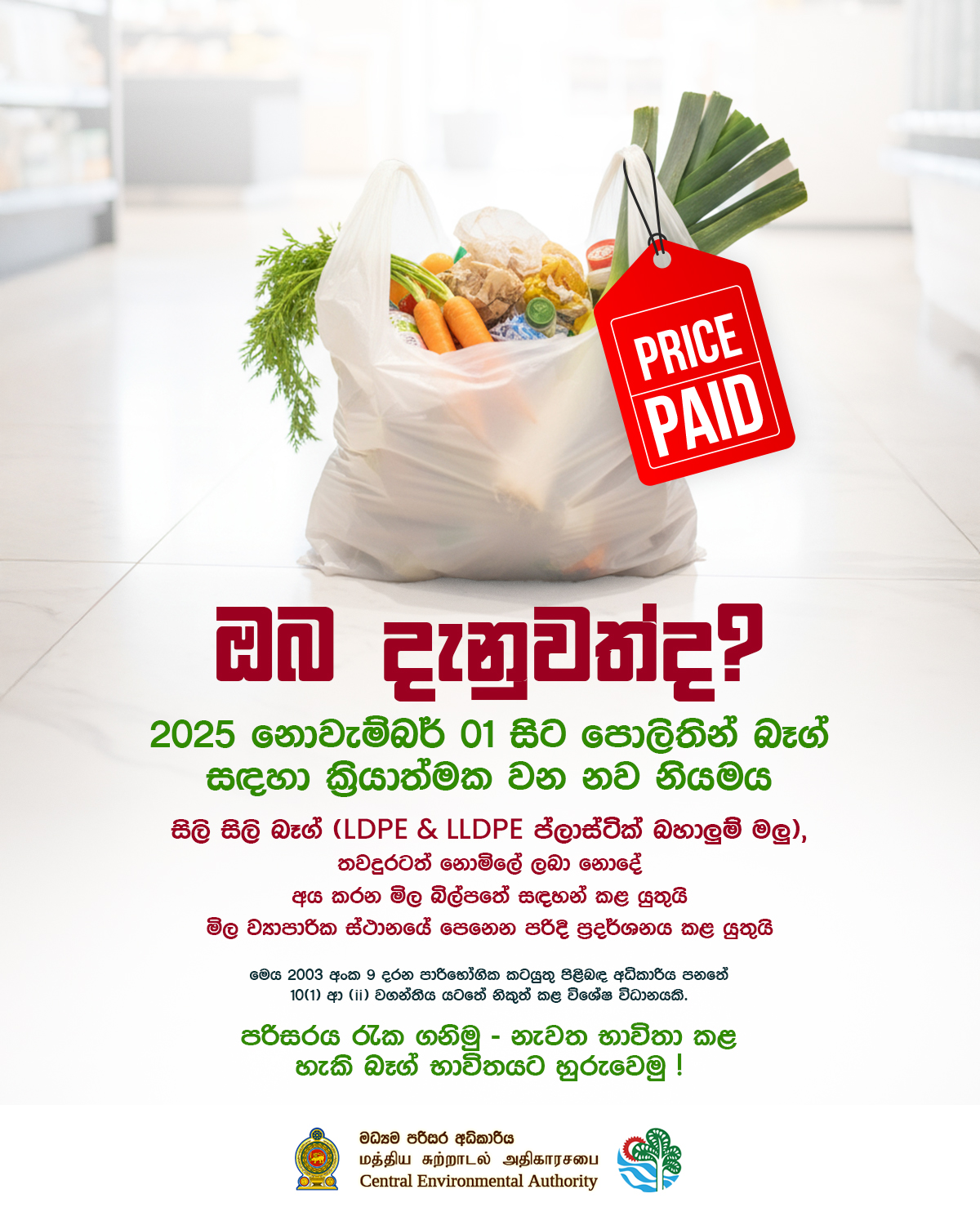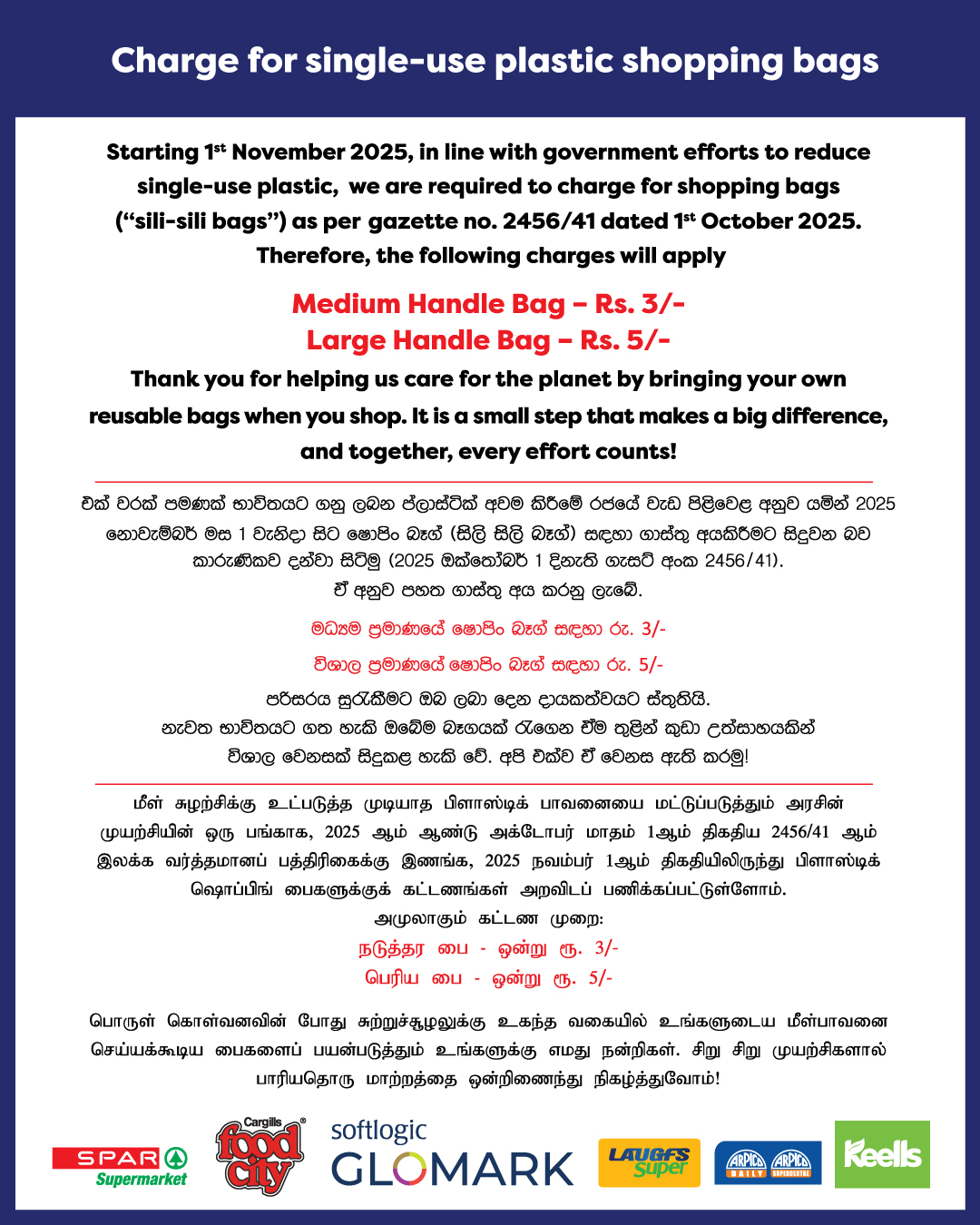 ෂොපින් බෑග් භාවිතය අවම කිරීමේ රජයේ වැඩපිලිවෙල හෙට (1) සිට ඇරඹීමට නියමිතය. ඒ අනුව පාරිභෝගික අධිකාරිය විිසින් ලංකාවේ සියලූම වෙළදසැල් වල හෙට සිට ෂොපින් බෑග් නොමිළේ නිකුත් කිරීම අත්හිටුවන ලෙස දැනුම් දී ඇති අතර ගැසට් නිවේදනයක් ද නිකුත් කර ඇත. හෙට සිට ෂොපින් බෑග් සදහා සදහා මුදලක් අයකරනු ලබයි. මධ්යම ප්රමාණයේ බෑගයකට රු 3 කුත් ලොකු බෑගයකට රු 5 කුත් මිලකර ඇත. ෂොපින් බෑග් අවම කිරීම හෝ නැතිකිරීම, පාරසරික ගැටළු රාශියකට විසදුමක් වන අතර පරිසරය රැකගැනීමට ද මෙවැනි විනාශකාරී අමුද්රව්ය භාවිතාවෙන් ඈත් විය යුතුය. ප්ලාස්ටික් වලින් තොර පාරිභෝජන රටාවක් හුුරුකිරිමට නම් ඒ සදහා විකල්ප වලට යා යුතු වන අතර ඉදිරියේදී අපේ රටට කඩදායි බෑග් ,රෙදි බෑග් බහුලව හා අඩුමිළට අවශ්ය වනු ඇත. මහ මග, ගංගා ඇලදො වල , මුහුදේ ,කාණු වල පරිසරයේ විසිකර දමන , දකින්න අප්රසන්න මේ ෂොපින් උර ,ෂොපින් බෑග් හෙට සිට අවම කිරීම පරිසරයට ආදරේ කරන සියලු ලංකාවාසී සැමගේ අරමුණ විය යුතුය.